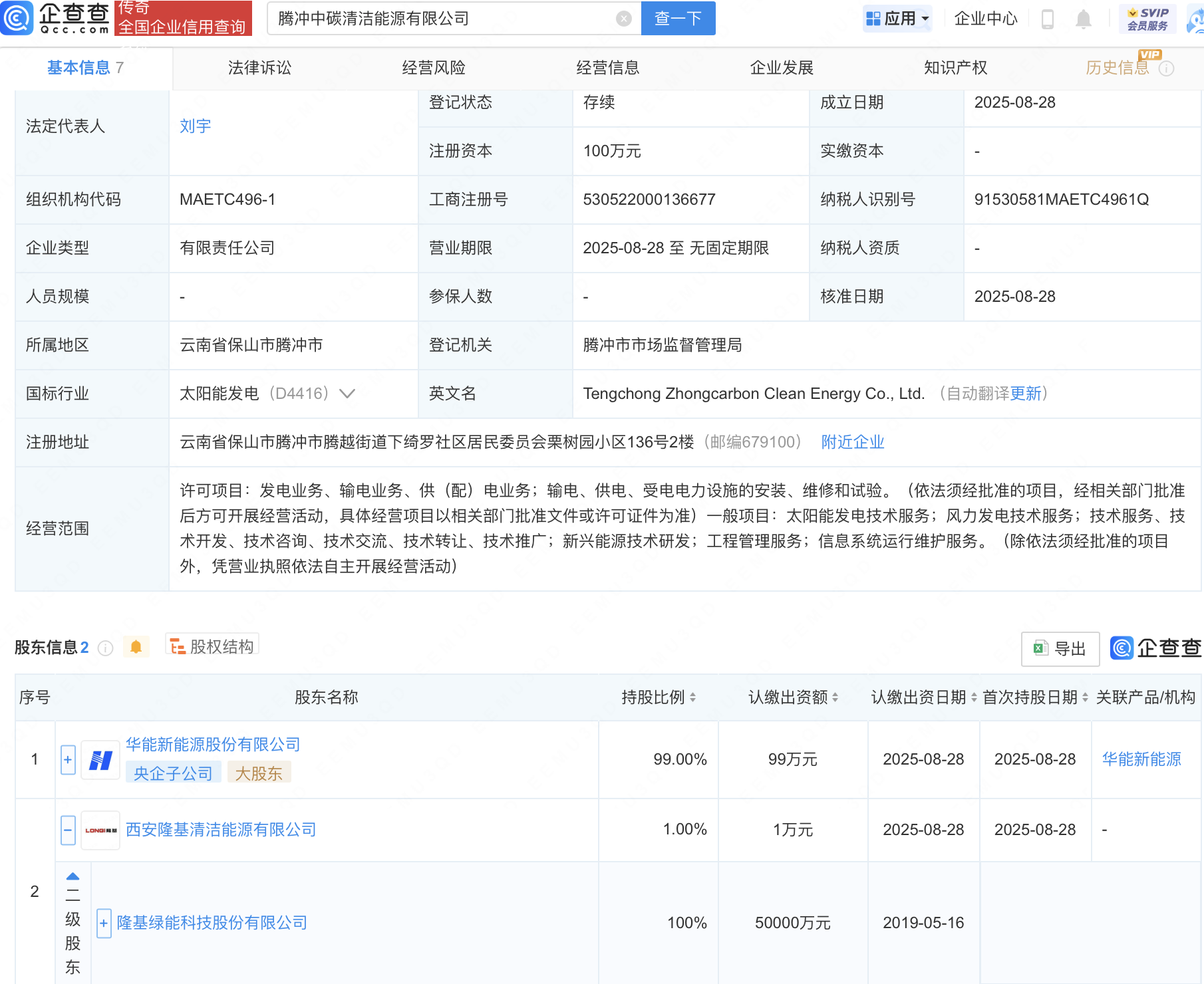 近日,腾冲中碳清洁能源有限公司成立,法定代表人为刘宇,经营范围包含:太阳能发电技术服务;风力发电技术服务;新兴能源技术研发等。企查查股权穿透显示,该公司由华能新能源股份有限公司、隆基绿能(601012)全资子公司西安隆基清洁能源有限公司共同持股。