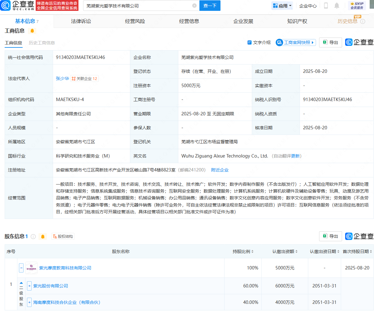 近日,芜湖紫光爱学技术有限公司成立,法定代表人为张少华,注册资本为5000万元,经营范围包含:人工智能应用软件开发;数据处理和存储支持服务;信息系统集成服务;互联网安全服务等。企查查股权穿透显示,该公司由紫光股份(000938)旗下紫光摩度教育科技有限公司全资持股。